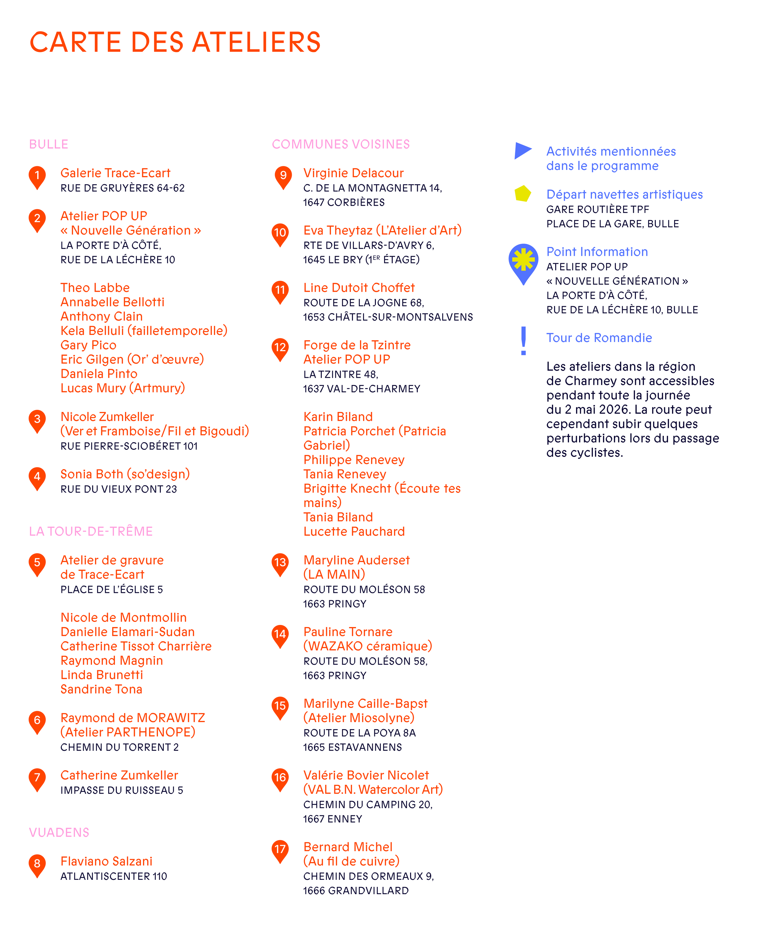Audrey Longchamp, François Gendre, Robin Braendli, Philippe Baumann (Debuhme), Saskia Piller (Saskialaxie), Violaine Hayoz, Felipe Montoya, Romain Buffetrille, Sibylle Bongard, Claude Wittmann, Tanja Hugenin-Dumittan